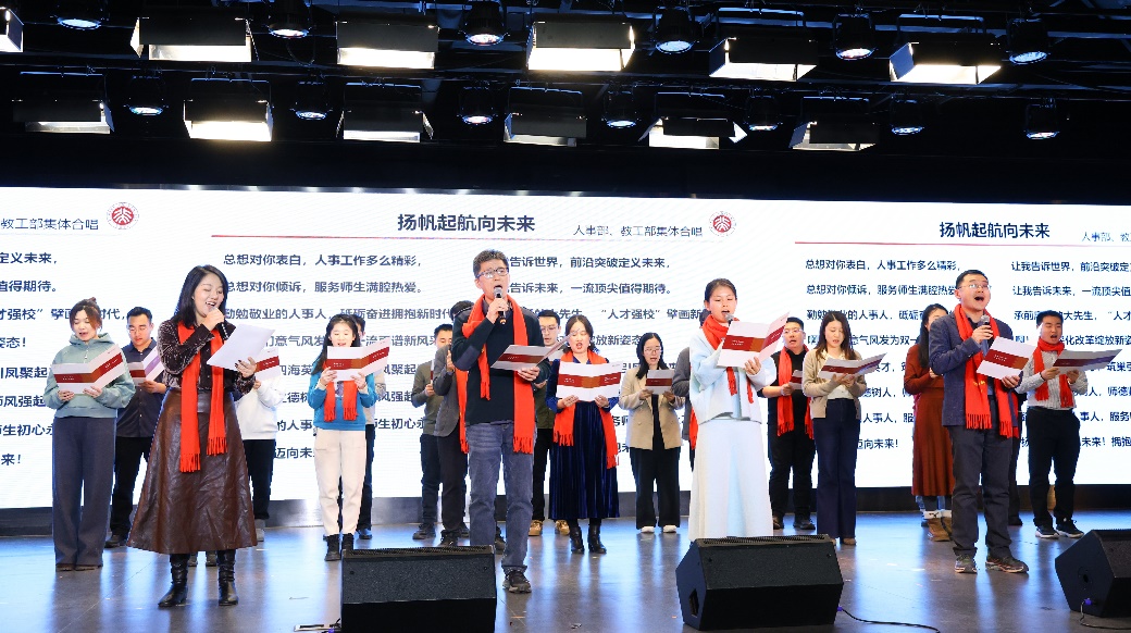 联欢会在人事部与党委教师工作部全体成员共同演唱的《扬帆起航向未来》中收尾。最后,全体演员共唱《相亲相爱一家人》《同一首歌》,用歌声与欢笑向2025年深情告别。